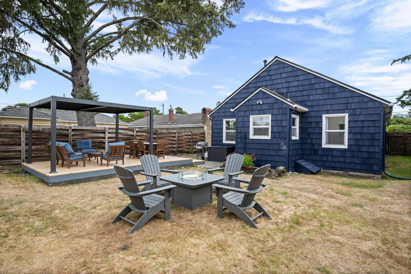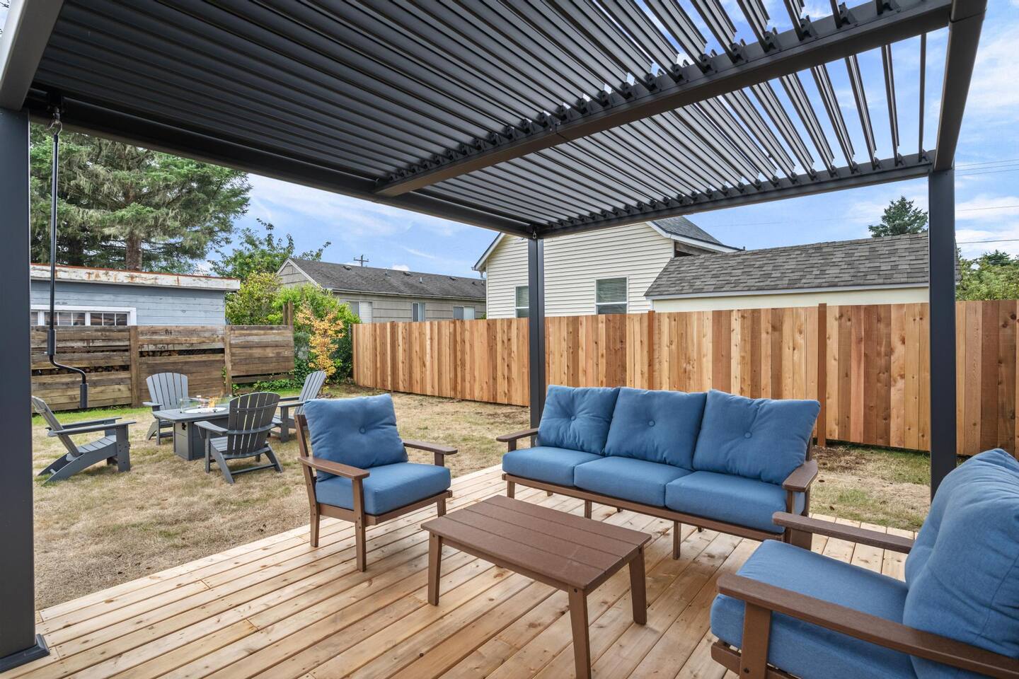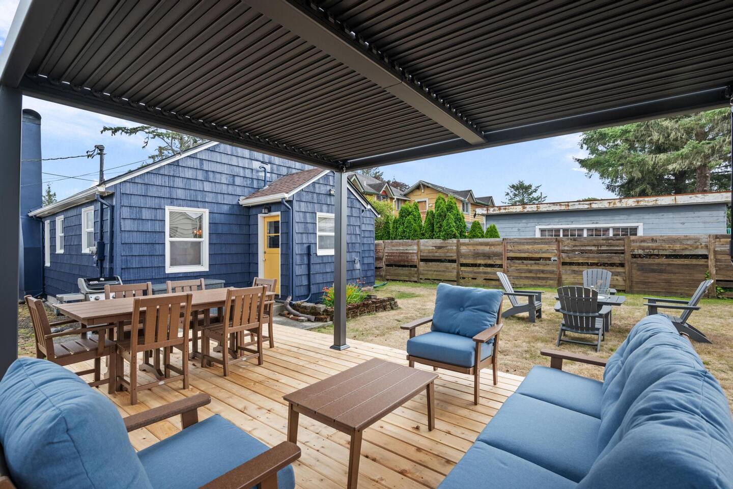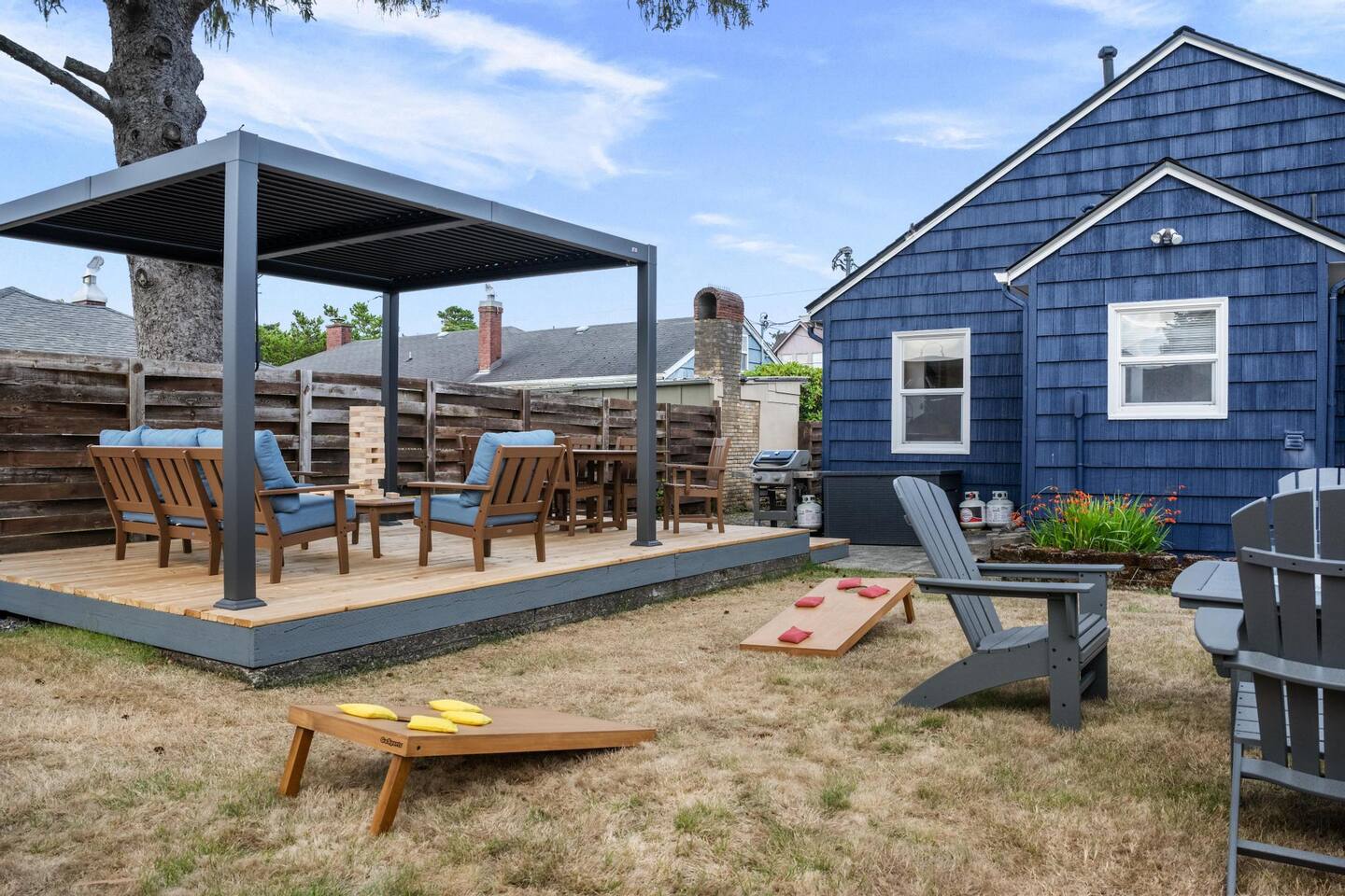Welcome to Seaside Solace, our charming beach cottage, uniquely curated with quirky decorations and newly updated to provide supremely comfortable accommodations. The open plan living/dining area provides a cozy atmosphere for lounging and gathering, whether you're playing board games, enjoying a movie on the 55" smart TV, or relaxing in front of the retro "fireplace", which has been fitted with 1950's lights that replicate flickering flames. Play your music on the bluetooth sound system and enjoy the artistic touches, including a custom wall mural and vintage decorations. Hang out in the beautiful back yard, which has an expansive deck with a louvered pergola that opens and closes to allow all-weather enjoyment. Relax on the comfy lounge furniture and play a game of cornhole or Giant Jenga. Grill burgers on the Weber and eat alfresco at the full dining set, lighting up the area with the rechargeable lanterns. Enjoy evenings around the propane firepit and make s'mores with the provided supplies! We've set up the three bedrooms for relaxation, comfort and convenience. Each room has a queen bed that lifts up for luggage storage and a wardrobe with hangers. We've provided linens, extra blankets, bath and beach towels, and washcloths. Each room is equipped with a white noise machine to help send you off to sleep, and blackout curtains to let you sleep in. Two of the bedrooms have smart TVs. The kitchen is fully equipped with all the cooking utensils and appliances you need to make a feast, including cookie sheets, mixing bowls, a casserole dish and a blender. We've provided oil, spices and seasonings too. The coffee station includes starter supplies of ground coffee and filters, K-cups, sugar/splenda and creamer, and there is a kettle with a selection of teas and hot chocolate. The bathroom features a tiled shower/bathtub with ample water pressure and on-demand hot water. We've provided a range of supplies to make your stay comfortable, including shampoo, conditioner and shower gel, cotton swabs and pads, floss picks and toothbrushes, and makeup cloths and a hair dryer. The full laundry includes a washer and dryer, and there are camp chairs and a beach umbrella to take with you to the beach. We hope you enjoy your stay and encourage you to reach out with any questions or concerns. We're here to make your stay as comfortable as possible. Thank you for choosing to stay at Seaside Solace, we know you'll have a wonderful time!
