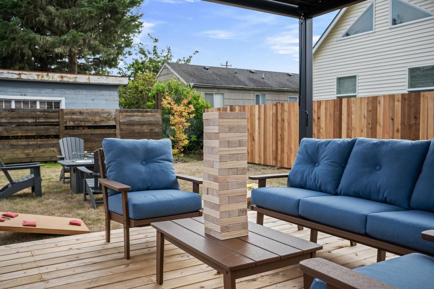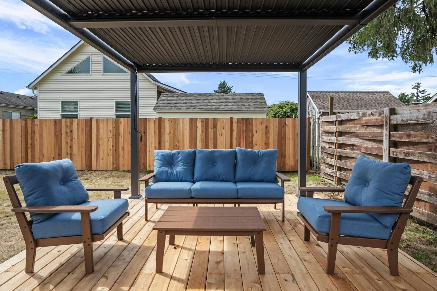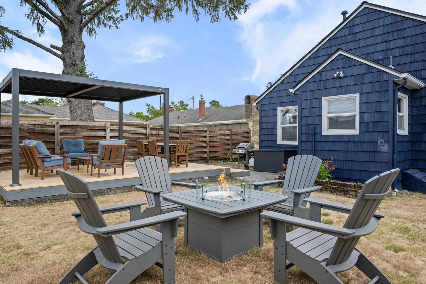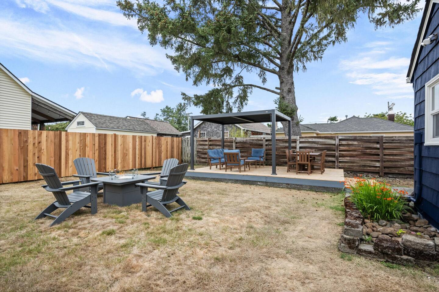 Welcome to Seaside Solace, our charming beach cottage, uniquely curated with quirky decorations and newly updated to provide supremely comfortable accommodations. The open plan living/dining area provides a cozy atmosphere for lounging and gathering, whether you're playing board games, enjoying a movie on the 55" smart TV, or relaxing in front of the retro "fireplace", which has been fitted with 1950's lights that replicate flickering flames. Play your music on the bluetooth sound system and enjoy the artistic touches, including a custom wall mural and vintage decorations. Hang out in the beautiful back yard, which has an expansive deck with a louvered pergola that opens and closes to allow all-weather enjoyment. Relax on the comfy lounge furniture and play a game of cornhole or Giant Jenga. Grill burgers on the Weber and eat alfresco at the full dining set, lighting up the area with the rechargeable lanterns. Enjoy evenings around the propane firepit and make s'mores with the provided supplies! We've set up the three bedrooms for relaxation, comfort and convenience. Each room has a queen bed that lifts up for luggage storage and a wardrobe with hangers. We've provided linens, extra blankets, bath and beach towels, and washcloths. Each room is equipped with a white noise machine to help send you off to sleep, and blackout curtains to let you sleep in. Two of the bedrooms have smart TVs. The kitchen is fully equipped with all the cooking utensils and appliances you need to make a feast, including cookie sheets, mixing bowls, a casserole dish and a blender. We've provided oil, spices and seasonings too. The coffee station includes starter supplies of ground coffee and filters, K-cups, sugar/splenda and creamer, and there is a kettle with a selection of teas and hot chocolate. The bathroom features a tiled shower/bathtub with ample water pressure and on-demand hot water. We've provided a range of supplies to make your stay comfortable, including shampoo, conditioner and shower gel, cotton swabs and pads, floss picks and toothbrushes, and makeup cloths and a hair dryer. The full laundry includes a washer and dryer, and there are camp chairs and a beach umbrella to take with you to the beach. We hope you enjoy your stay and encourage you to reach out with any questions or concerns. We're here to make your stay as comfortable as possible. Thank you for choosing to stay at Seaside Solace, we know you'll have a wonderful time!