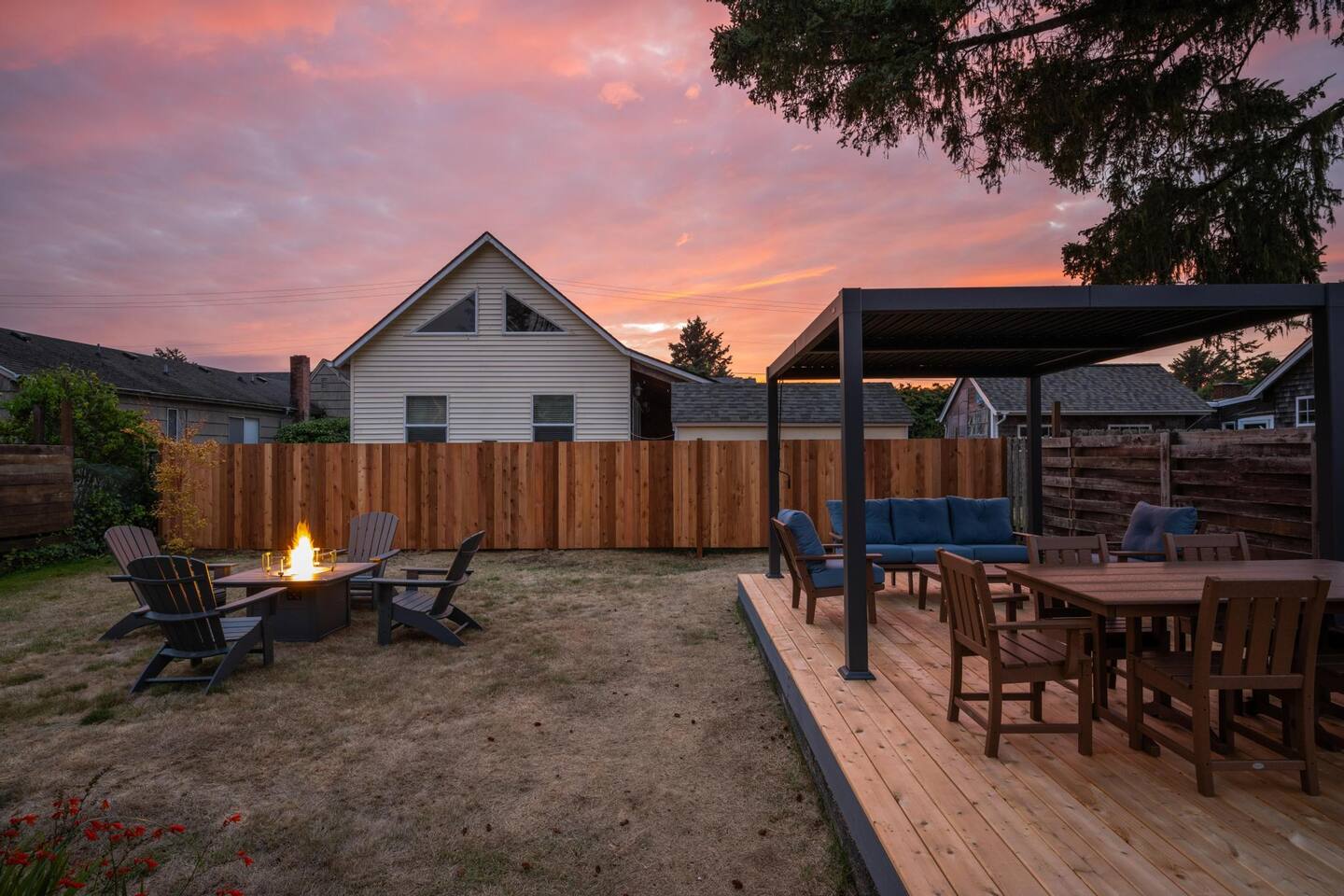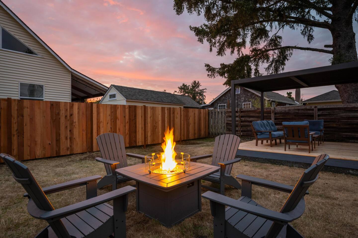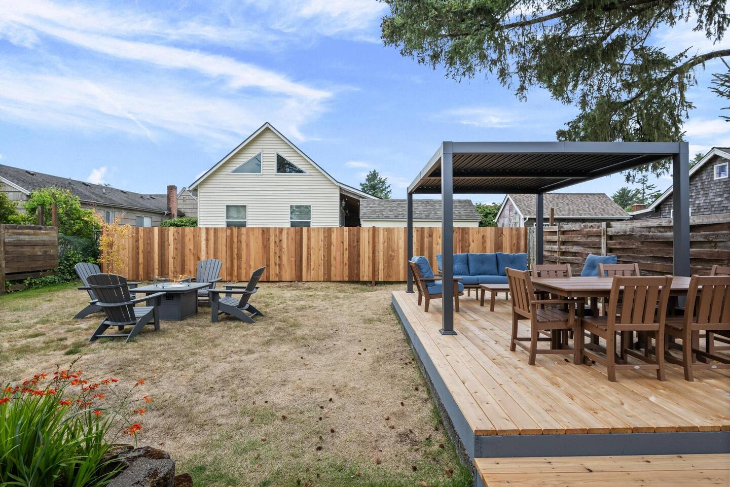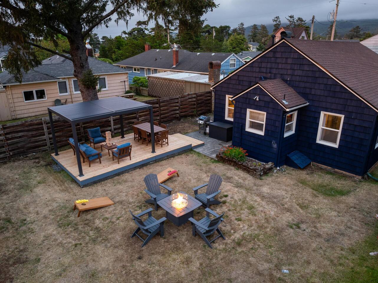 Welcome to Seaside Solace, our charming beach cottage, uniquely curated with quirky decorations and newly updated to provide supremely comfortable accommodations. The open plan living/dining area provides a cozy atmosphere for lounging and gathering, whether you're playing board games, enjoying a movie on the 55" smart TV, or relaxing in front of the retro "fireplace", which has been fitted with 1950's lights that replicate flickering flames. Play your music on the bluetooth sound system and enjoy the artistic touches, including a custom wall mural and vintage decorations. Hang out in the beautiful back yard, which has an expansive deck with a louvered pergola that opens and closes to allow all-weather enjoyment. Relax on the comfy lounge furniture and play a game of cornhole or Giant Jenga. Grill burgers on the Weber and eat alfresco at the full dining set, lighting up the area with the rechargeable lanterns. Enjoy evenings around the propane firepit and make s'mores with the provided supplies! We've set up the three bedrooms for relaxation, comfort and convenience. Each room has a queen bed that lifts up for luggage storage and a wardrobe with hangers. We've provided linens, extra blankets, bath and beach towels, and washcloths. Each room is equipped with a white noise machine to help send you off to sleep, and blackout curtains to let you sleep in. Two of the bedrooms have smart TVs. The kitchen is fully equipped with all the cooking utensils and appliances you need to make a feast, including cookie sheets, mixing bowls, a casserole dish and a blender. We've provided oil, spices and seasonings too. The coffee station includes starter supplies of ground coffee and filters, K-cups, sugar/splenda and creamer, and there is a kettle with a selection of teas and hot chocolate. The bathroom features a tiled shower/bathtub with ample water pressure and on-demand hot water. We've provided a range of supplies to make your stay comfortable, including shampoo, conditioner and shower gel, cotton swabs and pads, floss picks and toothbrushes, and makeup cloths and a hair dryer. The full laundry includes a washer and dryer, and there are camp chairs and a beach umbrella to take with you to the beach. We hope you enjoy your stay and encourage you to reach out with any questions or concerns. We're here to make your stay as comfortable as possible. Thank you for choosing to stay at Seaside Solace, we know you'll have a wonderful time!